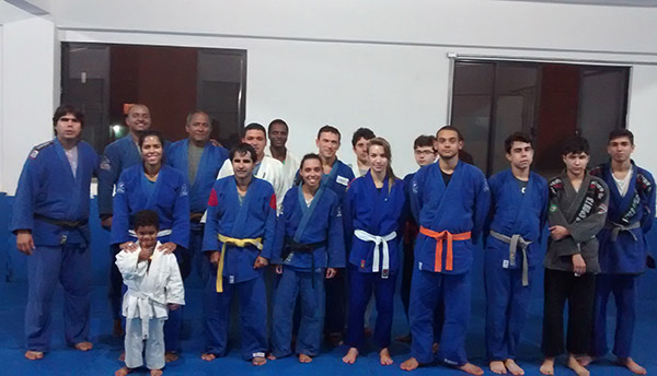 Os alunos de Judô de diversas faixas, na UENF, no final da aula com o professor Francisco de Alvarenga Leandro, concluindo mais um mês de muito empenho dos judocas